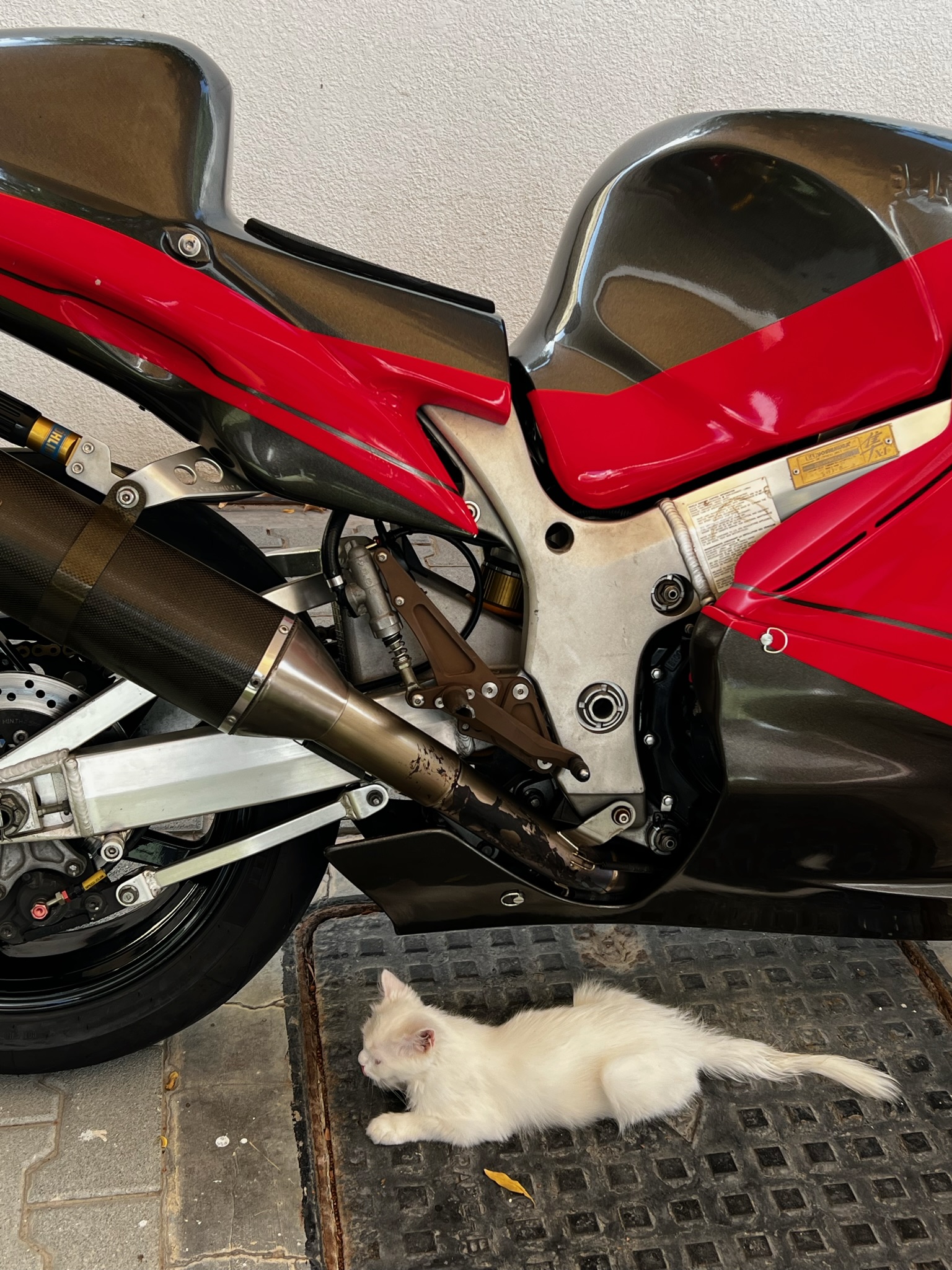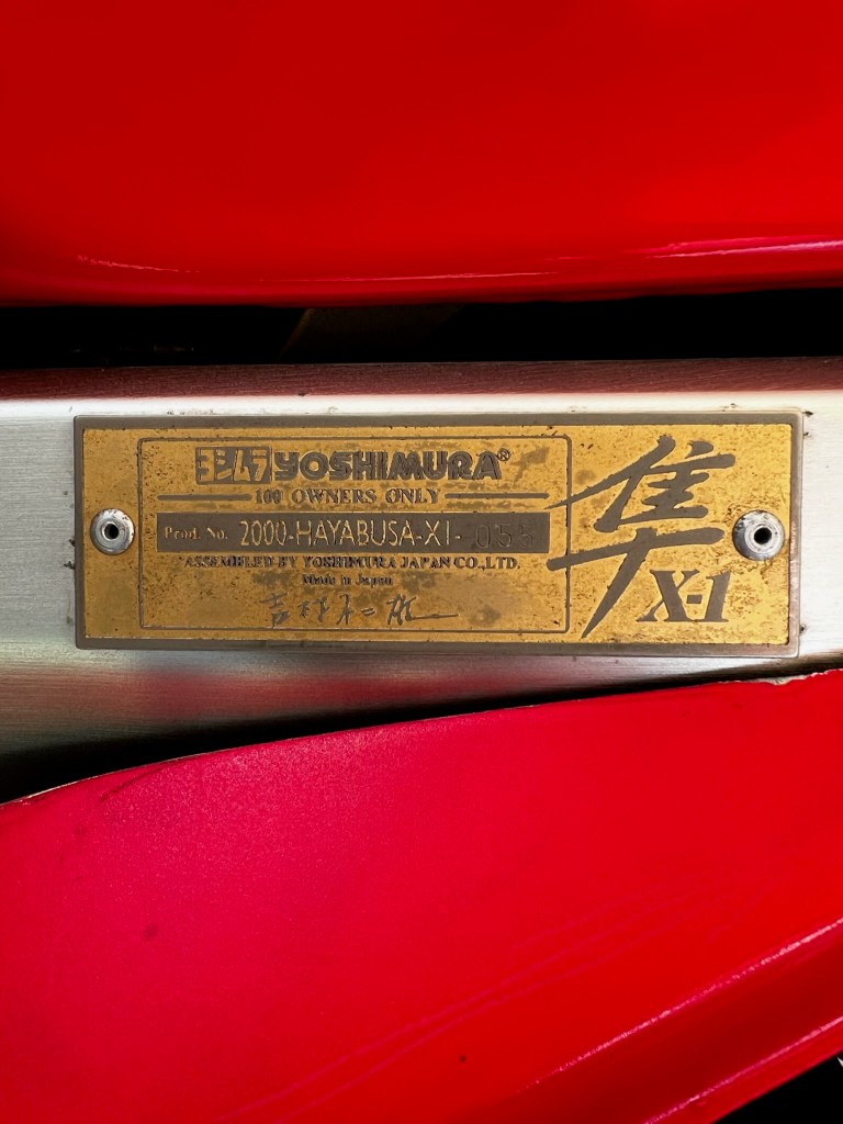 The story is that Yoshimura built a couple of special bikes to compete in the Suzuka 8-hr race, the Hayabusa was a strange choice, but did indeed wins it’s class against many smaller and more nimble bikes. To celebrate, with Suzuki’s blessing they made 100 for the road. This is number 55 of 100. It has many, many trick parts, not just from Yoshimura but Ohlins, Marchenisi etc. And of course lots of engine work, this beast should have 196hp at the rear wheel.