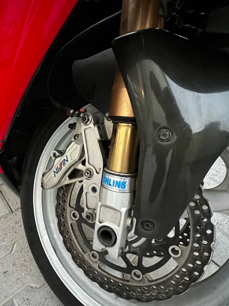 First job was to order some parts – replacing the Ohlins forks was saga, originally I put on some standard Hayabusa ones. Then I spent a few months sourcing parts to rebuild the damaged forks, not easy, but I got there eventually, salvaging what I could and adding in correct elements once found, finally I swapped over the old end caps and on they went – just perfect.